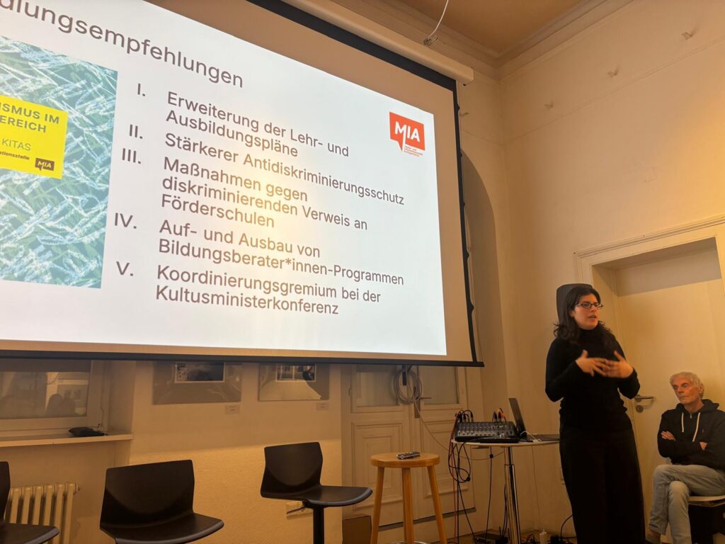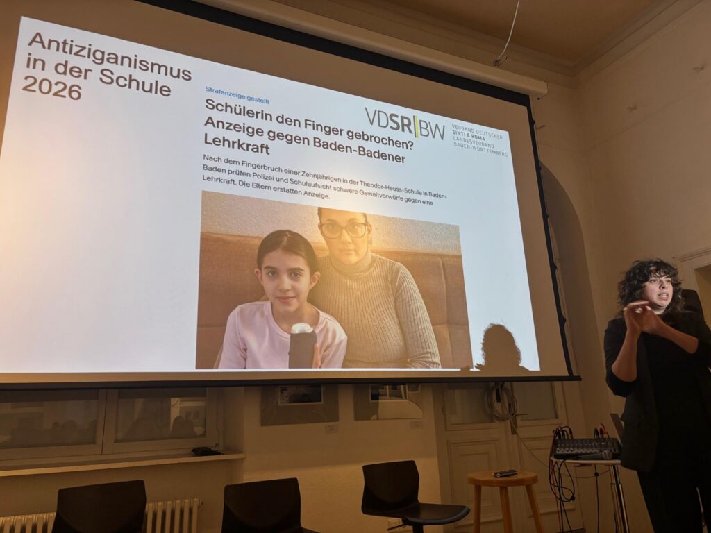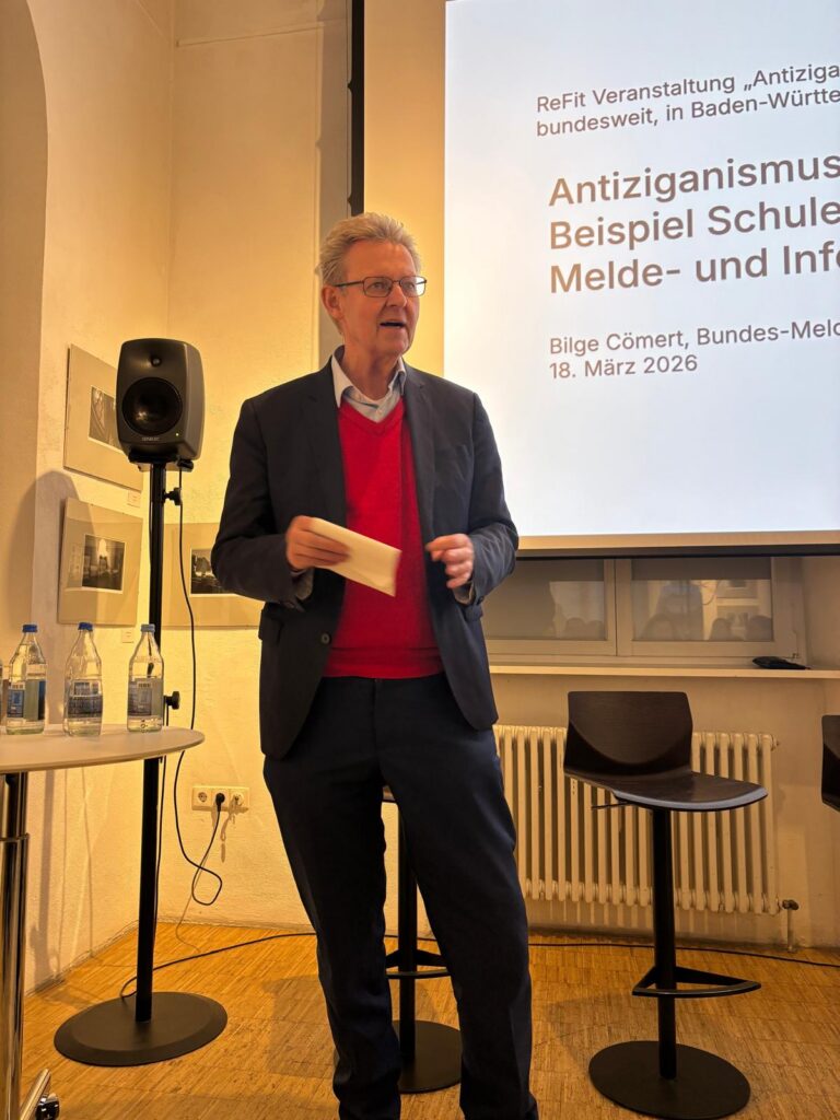 Im Mittelpunkt standen Befunde der Melde- und Informationsstelle gegen Antiziganismus (MIA), vorgestellt von Bilge Cömert (MIA Berlin) sowie Ergebnisse der partizipativen Bildungsstudie 2024, die der VDSR-BW selbst mit einem erfahrenen Forscher*nnenteam in Freiburg durchgeführt hatte.